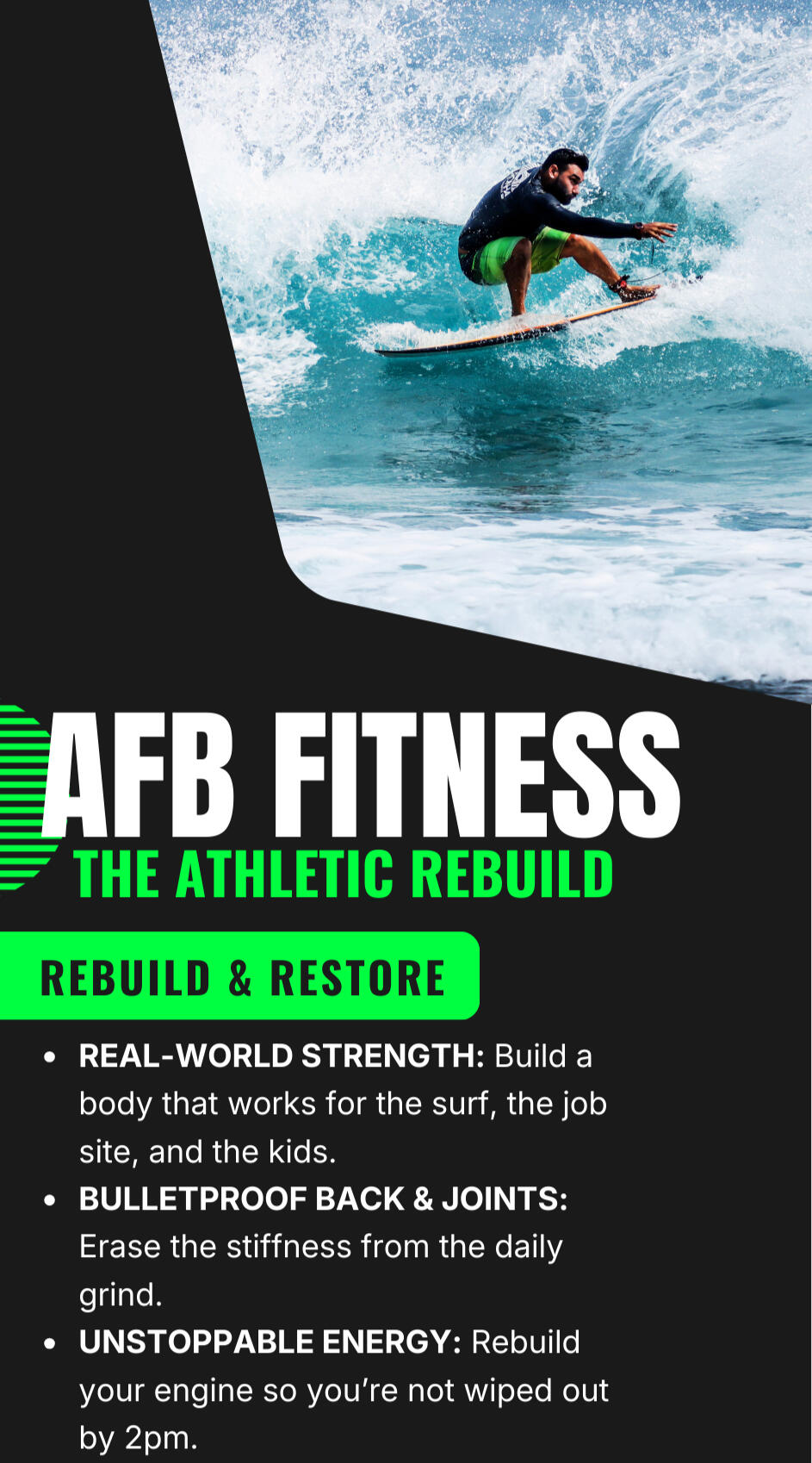 I’m not an influencer. I’m a career coach with over a decade of experience on the Sunshine Coast.I spent years watching people get broken by generic "hardcore" gym programs or stuck in endless loops of rehab exercises that never led to real strength. I built The Athletic Rebuild to solve that problem.My method bridges the gap between physiotherapy and high-performance training. Whether you want to surf better, play with your kids pain-free, or just reclaim the athleticism you had in your 20's, I build the road-map to get you there.
